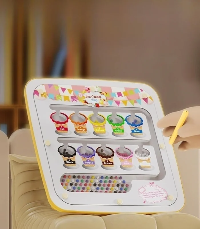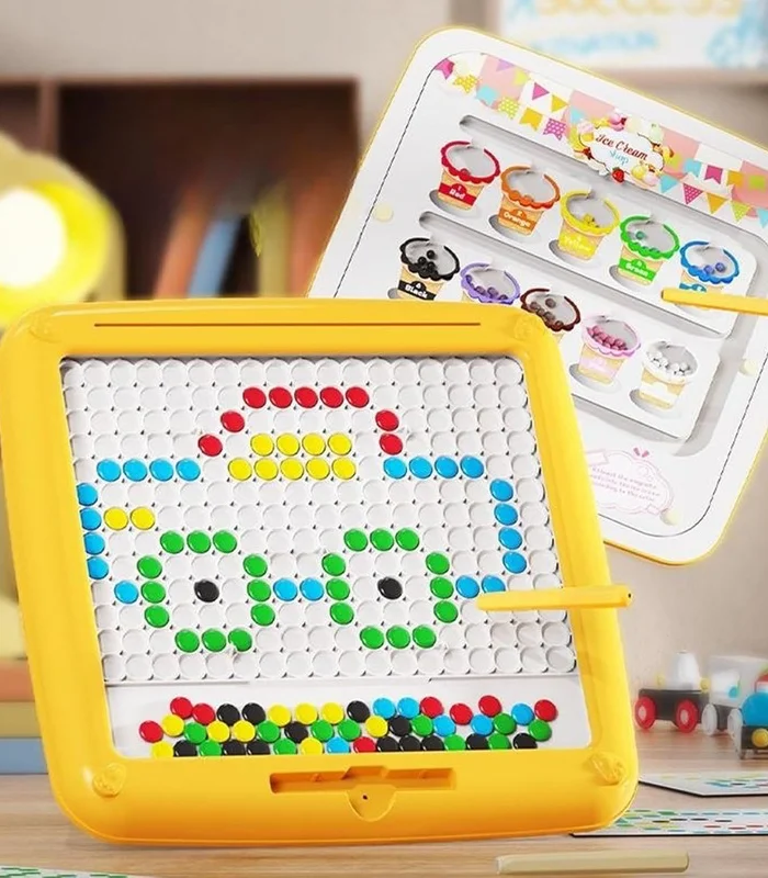 لوحة مغناطيس 2 في 1 بتجمع بين التعلّم واللعب: وجه للمتاهات والمطابقة بالألوان والأرقام، ووجه تاني للرسم المغناطيسي الحر أو تنفيذ بطاقات الأنشطة