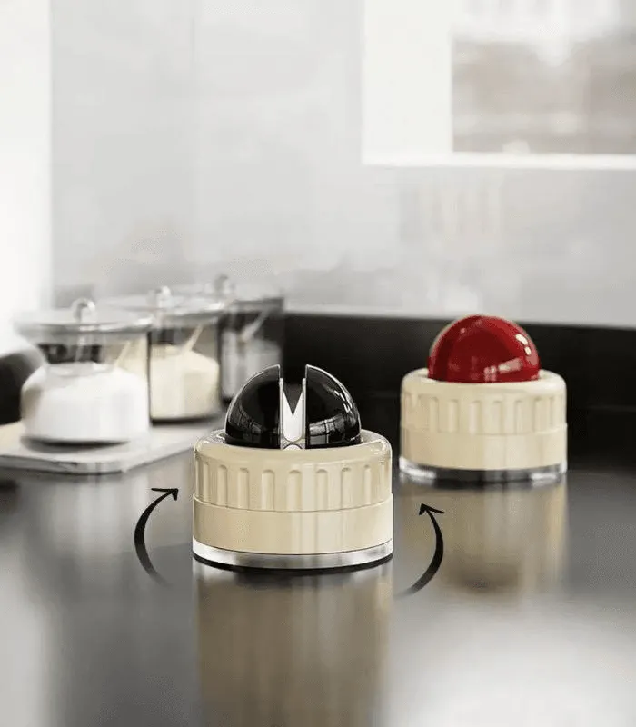 مبراة سكاكين مبتكرة بتصميم كروي مع قاعدة شفط قوية، مثالية لشحذ السكاكين والمقصات في المطبخ بسهولة وسرعة، مما يضمن حدة دائمة لأدواتك